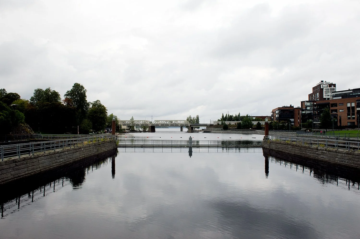 In architecture, urban, life, tampere, finland Tags river, rapids, dam, rocks, architecture, bridge, footbridge, buildings, museum, vapriikki, park, green, reflection, overcast, food, leipäjuusto, bread cheese, lakkahillo, cloudberry jam, manserock, life, travel, tammerkoski, tampere, finland, europe